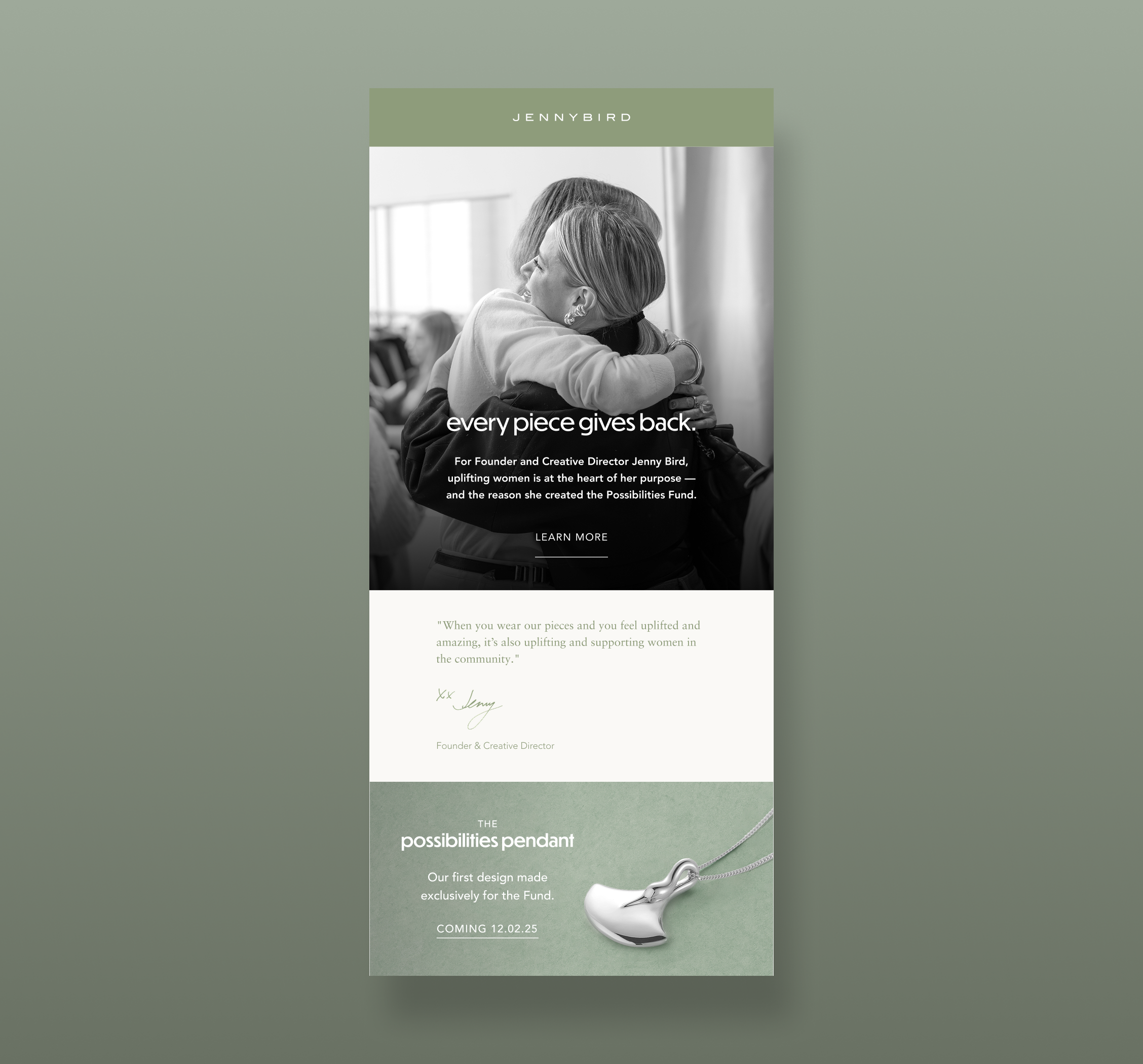 An identity and digital campaign system designed for JENNY BIRD’s social impact initiative, The Possibilities Fund.